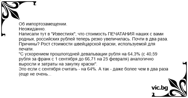 Написали тут в "Известиях", что стоимость ПЕЧАТАНИЯ наших с вами родных, российских рублей теперь резко увеличилась. Почти в два раза.