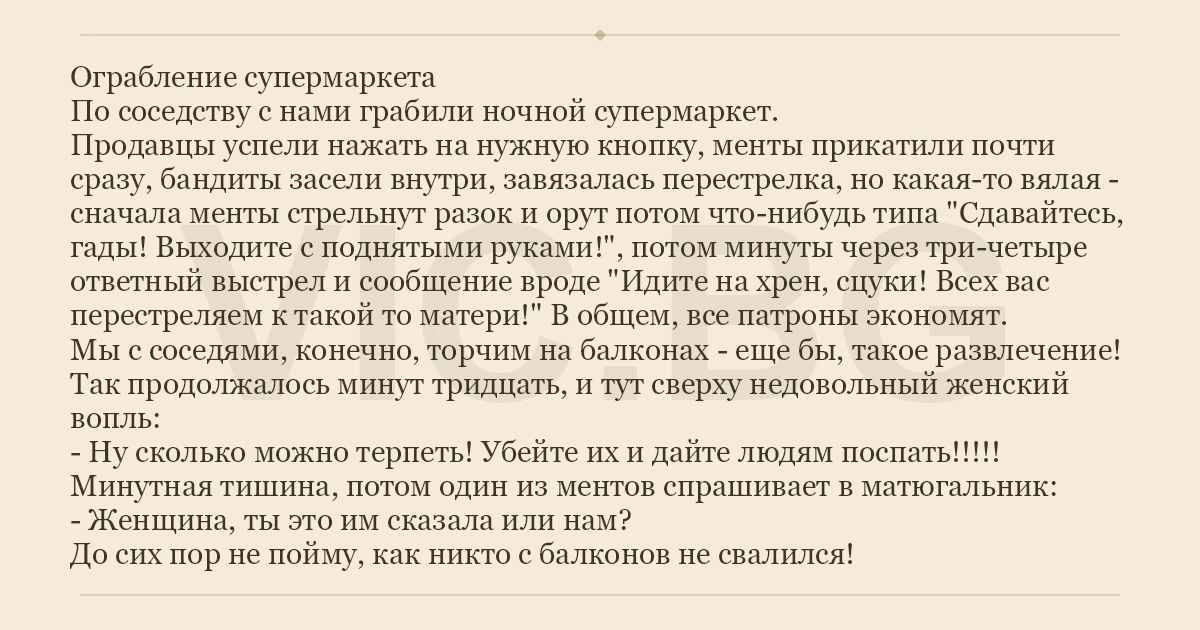 Ограбление супермаркета По соседству с нами грабили ночной супермаркет. Продавцы успели нажать на нужную кнопку, менты прикатили почти сразу, бандиты засели внутри, завязалась перестрелка, но какая-то вялая - сначала менты стрельнут разок и орут потом что-нибудь типа "Сдавайтесь, гады! Выходите с поднятыми руками!", потом минуты через три-четыре ответный выстрел и сообщение вроде "Идите на хpeн, сцуки! Всех вас перестреляем к такой то матери!" В общем, все патроны экономят. Мы с соседями, конечно, торчим на балконах - еще бы, такое развлечение! Так продолжалось минут тридцать, и тут сверху недовольный женский вопль: - Ну сколько можно терпеть! Убейте их и дайте людям поспать!!!!! Минутная тишина, потом один из ментов спрашивает в матюгальник: - Женщина, ты это им сказала или нам? До сих пор не пойму, как никто с балконов не свалился!