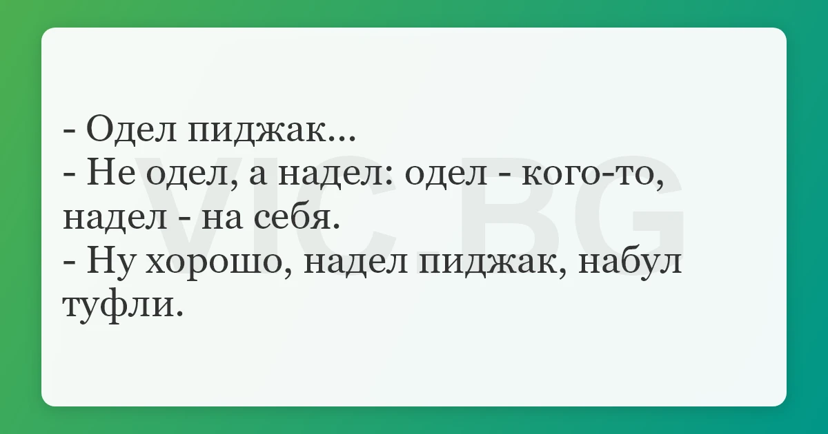 - Одел пиджак... - Не одел, а надел: одел - кого-то, надел - на себя. - Ну хорошо, надел пиджак, набул туфли.