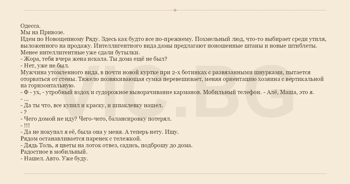 Одесса. Мы на Привозе. Идем по Новощепному Ряду. Здесь как будто все по-прежнему. Похмельный люд, что-то выбирает среди утиля, выложенного на продажу. Интеллигентного вида дамы предлагают поношенные штаны и новые штиблеты. Менее интеллигентные уже сдали бутылки. - Жора, тебя вчера жена искала. Ты дома ещё не был? - Нет, уже не был. Мужчина утомленного вида, в почти новой куртке при 2-х ботинках с развязанными шнурками, пытается оторваться от стены. Тяжело позвякивающая сумка перевешивает, меняя ориентацию хозяина с вертикальной на горизонтальную. - Ф - ух, - утробный вздох и судорожное выворачивание карманов. Мобильный телефон. - Алё, Маша, это я. - ... - Да ты что, все купил и краску, и шпаклевку нашел. - ? - Чего домой не иду? Чего-чего, балансировку потерял. - !!! - Да не покупал я её, была она у меня. А теперь нету. Ищу. Рядом останавливается паренек с тележкой. - Дядь Толь, я цветы на лоток отвез, садись, подброшу до дома. Радостное в мобильный. - Нашел. Авто. Уже буду.