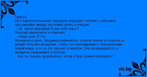 Женщина в шоке, продавец извиняется, относит клетку в сторонку и делает попугаю внушение, чтобы тот разговаривал с покупателями повежливее, а то он его засунет в кипяток. Они возвращаются, и женщина спрашивает у попугая: