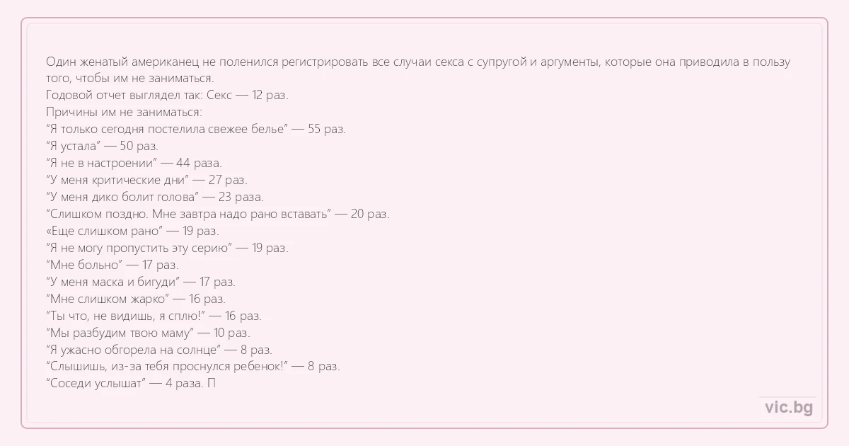 Один женатый американец не поленился регистрировать все случаи cekca с супругой и аргументы, которые она приводила в пользу того, чтобы им не заниматься. Годовой отчет выглядел так: Cekc — 12 раз. Причины им не заниматься: “Я только сегодня постелила свежее белье” — 55 раз. “Я устала” — 50 раз. “Я не в настроении” — 44 раза. “У меня критические дни” — 27 раз. “У меня дико болит голова” — 23 раза. “Слишком поздно. Мне завтра надо рано вставать” — 20 раз. «Еще слишком рано” — 19 раз. “Я не могу пропустить эту серию” — 19 раз. “Мне больно” — 17 раз. “У меня маска и бигуди” — 17 раз. “Мне слишком жарко” — 16 раз. “Ты что, не видишь, я сплю!” — 16 раз. “Мы разбудим твою маму” — 10 раз. “Я ужасно обгорела на солнце” — 8 раз. “Слышишь, из-за тебя проснулся ребенок!” — 8 раз. “Соседи услышат” — 4 раза. П