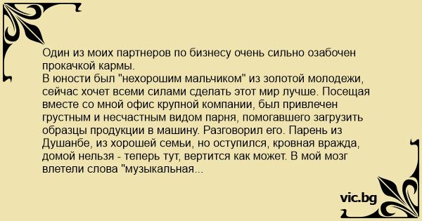 Один из моих партнеров по бизнесу очень сильно озабочен прокачкой кармы.