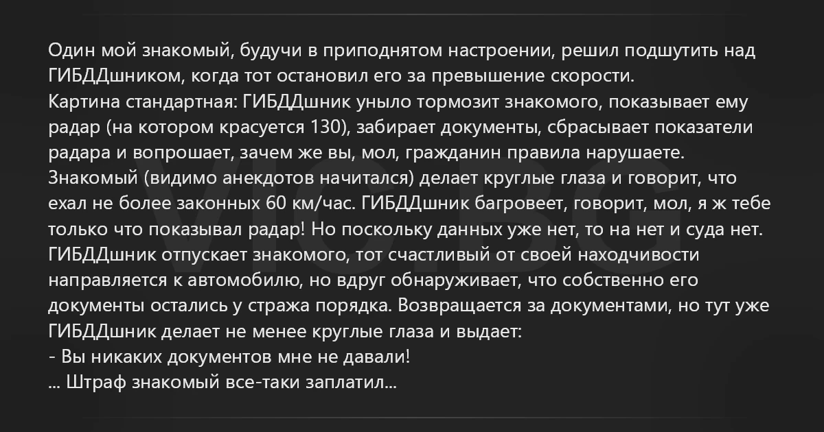 Один мой знакомый, будучи в приподнятом настроении, решил подшутить над ГИБДДшником, когда тот остановил его за превышение скорости. Картина стандартная: ГИБДДшник уныло тормозит знакомого, показывает ему радар (на котором красуется 130), забирает документы, сбрасывает показатели радара и вопрошает, зачем же вы, мол, гражданин правила нарушаете. Знакомый (видимо анекдотов начитался) делает круглые глаза и говорит, что ехал не более законных 60 км/час. ГИБДДшник багровеет, говорит, мол, я ж тебе только что показывал радар! Но поскольку данных уже нет, то на нет и суда нет. ГИБДДшник отпускает знакомого, тот счастливый от своей находчивости направляется к автомобилю, но вдруг обнаруживает, что собственно его документы остались у стража порядка. Возвращается за документами, но тут уже ГИБДДшник делает не менее круглые глаза и выдает: - Вы никаких документов мне не давали! ... Штраф знакомый все-таки заплатил...