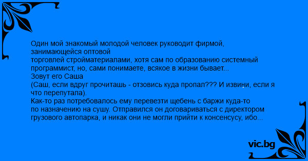 Один мой знакомый молодой человек руководит фирмой, занимающейся оптовой торговлей стройматериалами, хотя сам по образованию системный программист, но, сами понимаете, всякое в жизни бывает...