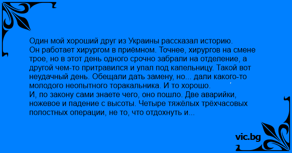 Он работает хирургом в приёмном. Точнее, хирургов на смене трое, но в этот день одного срочно забрали на отделение, а другой чем-то притравился и упал под капельницу. Такой вот неудачный день. Обещали дать замену, но... дали какого-то молодого неопытного торакальника. И то хорошо.