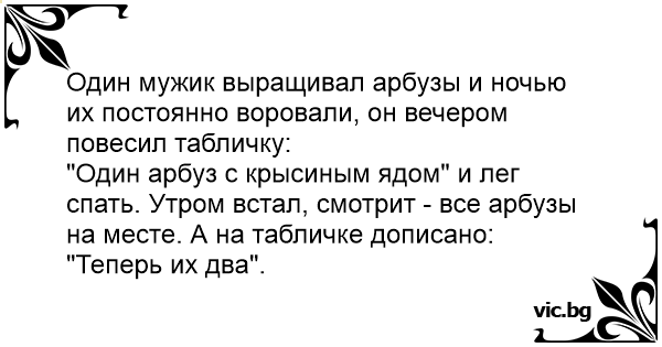 "Один арбуз с крысиным ядом" и лег спать. Утром встал, смотрит - все арбузы на месте. А на табличке дописано: "Теперь их два".