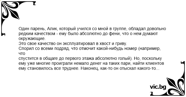 Один парень, Алик, который учился со мной в группе, обладал довольно редким качеством - ему было абсолютно до фени, что о нем думают окружающие.