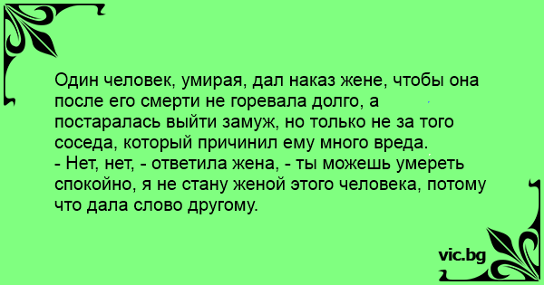 Один человек, умирая, дал наказ жене, чтобы она после его смерти не горевала долго, а постаралась выйти замуж, но только не за того соседа, который причинил ему много вреда.