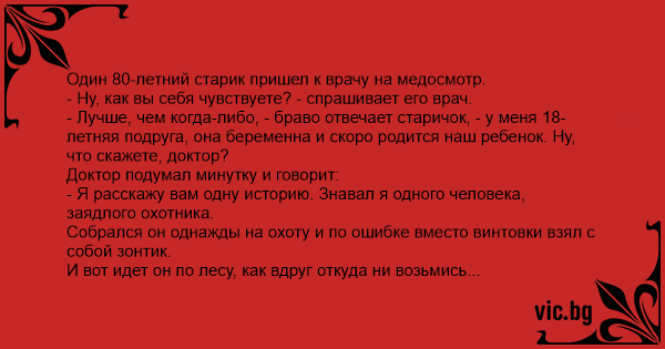 - Лучше, чем когда-либо, - браво отвечает старичок, - у меня 18-летняя подруга, она беременна и скоро родится наш ребенок. Ну, что скажете, доктор?