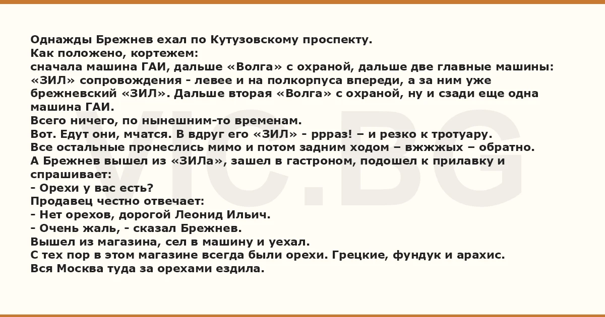 Однажды Брежнев ехал по Кутузовскому проспекту. Как положено, кортежем: сначала машина ГАИ, дальше «Волга» с охраной, дальше две главные машины: «ЗИЛ» сопровождения - левее и на полкорпуса впереди, а за ним уже брежневский «ЗИЛ». Дальше вторая «Волга» с охраной, ну и сзади еще одна машина ГАИ. Всего ничего, по нынешним-то временам. Вот. Едут они, мчатся. В вдруг его «ЗИЛ» - ррраз! – и резко к тротуару. Все остальные пронеслись мимо и потом задним ходом – вжжжых – обратно. А Брежнев вышел из «ЗИЛа», зашел в гастроном, подошел к прилавку и спрашивает: - Орехи у вас есть? Продавец честно отвечает: - Нет орехов, дорогой Леонид Ильич. - Очень жаль, - сказал Брежнев. Вышел из магазина, сел в машину и уехал. С тех пор в этом магазине всегда были орехи. Грецкие, фундук и арахис. Вся Москва туда за орехами ездила.