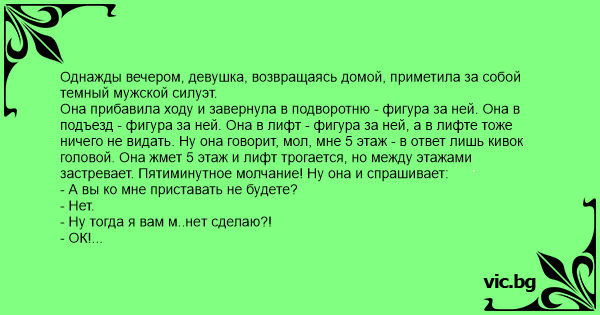 Она прибавила ходу и завернула в подворотню - фигура за ней. Она в подъезд - фигура за ней. Она в лифт - фигура за ней, а в лифте тоже ничего не видать. Ну она говорит, мол, мне 5 этаж - в ответ лишь кивок головой. Она жмет 5 этаж и лифт трогается, но между этажами застревает. Пятиминутное молчание! Ну она и спрашивает: