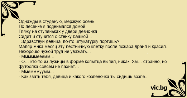 - Как звать тебя, девица и какого козленочка ты сидишь возле моей двери? Я женат, у меня уже есть дочка и вторую мне не надо. Да и домашних животных я в квартире держать не люблю.