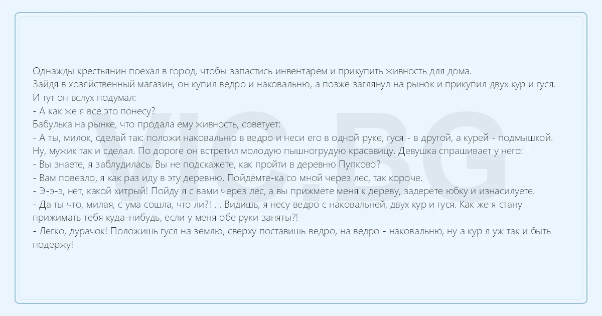 Однажды крестьянин поехал в город, чтобы запастись инвентарём и прикупить живность для дома. Зайдя в хозяйственный магазин, он купил ведро и наковальню, а позже заглянул на рынок и прикупил двух kуp и гуся. И тут он вслух подумал: - А как же я всё это понесу? Бабулька на рынке, что продала ему живность, советует: - А ты, милок, сделай так: положи наковальню в ведро и неси его в одной руке, гуся - в другой, а курей - подмышкой. Ну, мужик так и сделал. По дороге он встретил молодую пышногрудую красавицу. Девушка спрашивает у него: - Вы знаете, я заблудилась. Вы не подскажете, как пройти в деревню Пупково? - Вам повезло, я как раз иду в эту деревню. Пойдёмте-ка со мной через лес, так короче. - Э-э-э, нет, какой хитрый! Пойду я с вами через лес, а вы прижмёте меня к дереву, задерёте юбку и изнасилуете. - Да ты что, милая, с ума сошла, что ли?! . . Видишь, я несу ведро с наковальней, двух kуp и гуся. Как же я стану прижимать тебя куда-нибудь, если у меня обе руки заняты?! - Легко, дурачок! Положишь гуся на землю, сверху поставишь ведро, на ведро - наковальню, ну а kуp я уж так и быть подержу!