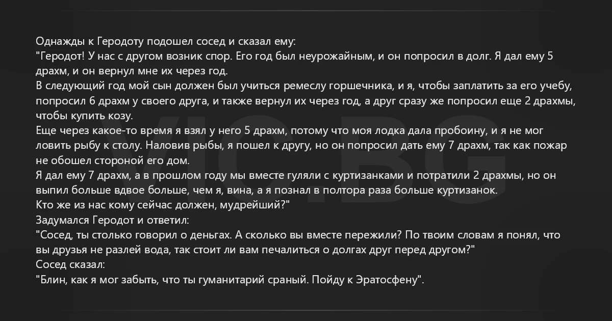 Однажды к Геродоту подошел сосед и сказал ему: "Геродот! У нас с другом возник спор. Его год был неурожайным, и он попросил в долг. Я дал ему 5 драхм, и он вернул мне их через год. В следующий год мой сын должен был учиться ремеслу горшечника, и я, чтобы заплатить за его учебу, попросил 6 драхм у своего друга, и также вернул их через год, а друг сразу же попросил еще 2 драхмы, чтобы купить козу. Еще через какое-то время я взял у него 5 драхм, потому что моя лодка дала пробоину, и я не мог ловить рыбу к столу. Наловив рыбы, я пошел к другу, но он попросил дать ему 7 драхм, так как пожар не обошел стороной его дом. Я дал ему 7 драхм, а в прошлом году мы вместе гуляли с куртизанками и потратили 2 драхмы, но он выпил больше вдвое больше, чем я, вина, а я познал в полтора раза больше куртизанок. Кто же из нас кому сейчас должен, мудрейший?" Задумался Геродот и ответил: "Сосед, ты столько говорил о деньгах. А сколько вы вместе пережили? По твоим словам я понял, что вы друзья не разлей вода, так стоит ли вам печалиться о долгах друг перед другом?" Сосед сказал: "Блин, как я мог забыть, что ты гуманитарий cpaный. Пойду к Эратосфену".