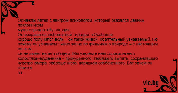 Однажды летел с венгром-психологом, который оказался давним поклонником мультсериала «Ну погоди».