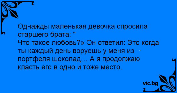 Что такое любовь?» Он ответил: Это когда ты каждый день воруешь у меня из портфеля шоколад… А я продолжаю класть его в одно и тоже место.