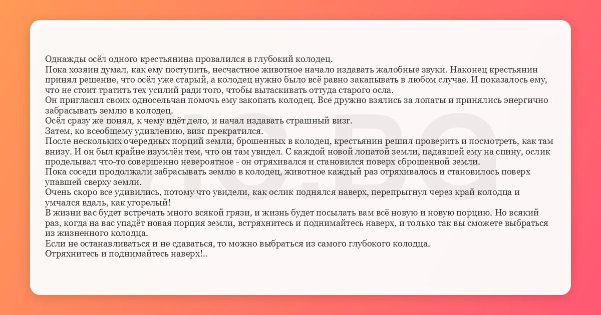 Однажды осёл одного крестьянина провалился в глубокий колодец. Пока хозяин думал, как ему поступить, несчастное животное начало издавать жалобные звуки. Наконец крестьянин принял решение, что осёл уже старый, а колодец нужно было всё равно закапывать в любом случае. И показалось ему, что не стоит тратить тех усилий ради того, чтобы вытаскивать оттуда старого осла. Он пригласил своих односельчан помочь ему закопать колодец. Все дружно взялись за лопаты и принялись энергично забрасывать землю в колодец. Осёл сразу же понял, к чему идёт дело, и начал издавать страшный визг. Затем, ко всеобщему удивлению, визг прекратился. После нескольких очередных порций земли, брошенных в колодец, крестьянин решил проверить и посмотреть, как там внизу. И он был крайне изумлён тем, что он там увидел. С каждой новой лопатой земли, падавшей ему на спину, ослик проделывал что-то совершенно невероятное - он отряхивался и становился поверх сброшенной земли. Пока соседи продолжали забрасывать землю в колодец, животное каждый раз отряхивалось и становилось поверх упавшей сверху земли. Очень скоро все удивились, потому что увидели, как ослик поднялся наверх, перепрыгнул через край колодца и умчался вдаль, как угорелый! В жизни вас будет встречать много всякой грязи, и жизнь будет посылать вам всё новую и новую порцию. Но всякий раз, когда на вас упадёт новая порция земли, встряхнитесь и поднимайтесь наверх, и только так вы сможете выбраться из жизненного колодца. Если не останавливаться и не сдаваться, то можно выбраться из самого глубокого колодца. Отряхнитесь и поднимайтесь наверх!..