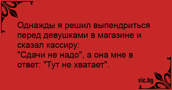 Однажды я решил выпендриться перед девушками в магазине и сказал кассиру:<br />"Сдачи не надо", а она мне в ответ: "Тут не хватает".