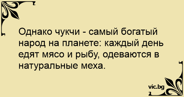 Однако чукчи - самый богатый народ на планете: каждый день едят мясо и рыбу, одеваются в натуральные меха.