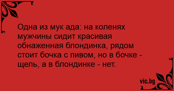 Одна из мук ада: на коленях мужчины сидит красивая обнаженная блондинка, рядом стоит бочка с пивом, но в бочке - щель, а в блондинке - нет.