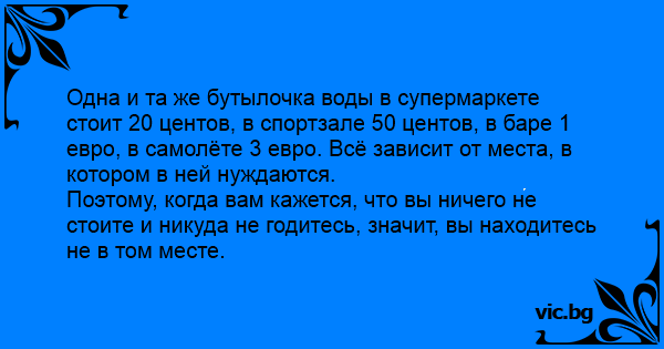 Одна и та же бутылочка воды в супермаркете стоит 20 центов, в спортзале 50 центов, в баре 1 евро, в самолёте 3 евро. Всё зависит от места, в котором в ней нуждаются.