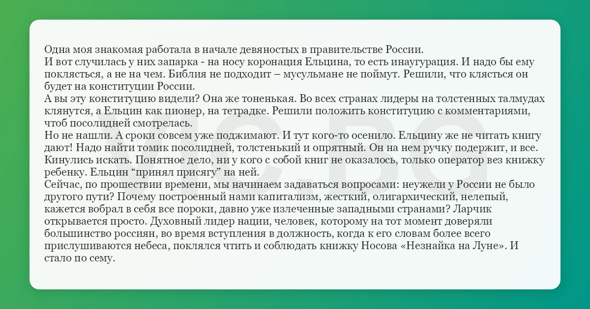 И вот случилась у них запарка - на носу коронация Ельцина, то есть инаугурация. И надо бы ему поклясться, а не на чем. Библия не подходит – мусульмане не поймут. Решили, что клясться он будет на конституции России.