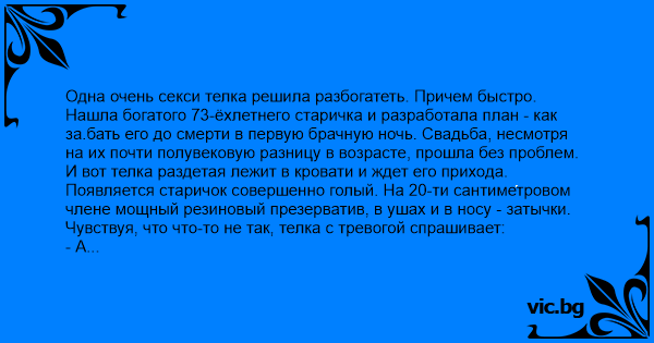 Нашла богатого 73-ёхлетнего старичка и разработала план - как за.бать его до смерти в первую брачную ночь. Свадьба, несмотря на их почти полувековую разницу в возрасте, прошла без проблем.