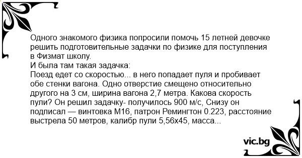 Поезд едет со скоростью... в него попадает пуля и пробивает обе стенки вагона. Одно отверстие смещено относительно другого на 3 см, ширина вагона 2,7 метра. Какова скорость пули? Он решил задачку- получилось 900 м/с, Снизу он подписал — винтовка М16, патрон Ремингтон 0.223, расстояние выстрела 50 метров, калибр пули 5,56х45, масса пули 3.6 гр,