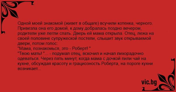 Одной моей знакомой (живет в общаге) всучили котенка, черного. Привезла она его домой, к дому добралась поздно вечером, родители уже легли спать. Дверь ей мама открыла. Отец, лежа на своей половине супружеской постели, слышит звук открываемой двери, потом голос: "Мама, познакомься, это - Роберт! " "Твою мать! "... - подумал отец, вскочил и начал лихорадочно одеваться. Через пять минут, когда мама с дочкой пили чай на кухне, обсуждая красоту и грациозность Роберта, на пороге кухни возникает отец с сияющим лицом, в костюме, галстуке и с запотевшей бутылью самогона в руках...