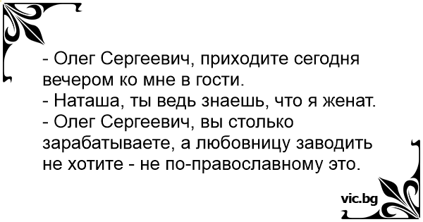 - Олег Сергеевич, вы столько зарабатываете, а любовницу заводить не хотите - не по-православному это.
