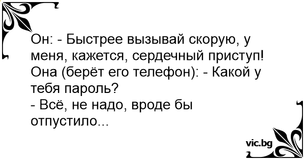 Он: - Быстрее вызывай скорую, у меня, кажется, сердечный приступ!