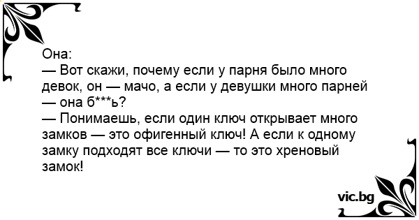 — Вот скажи, почему если у парня было много девок, он — мачо, а если у девушки много парней — она б***ь?