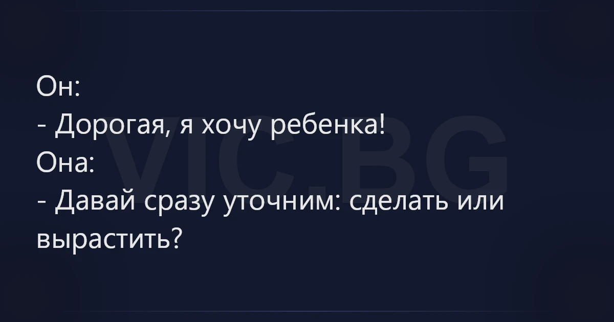Он: - Дорогая, я хочу ребенка! Она: - Давай сразу уточним: сделать или вырастить?