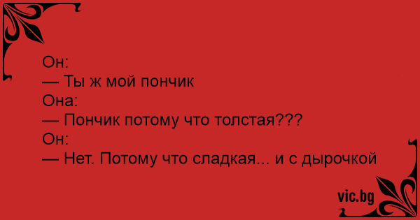 Він: — Ти ж моя пампушку. Вона: — Пампушка бо товста??? Він: — Ні. Бо солодка ... і з дірочкою.