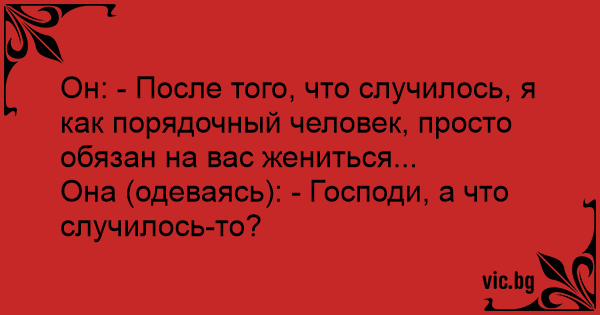 Он: - После того, что случилось, я как порядочный человек, просто обязан на вас жениться...
