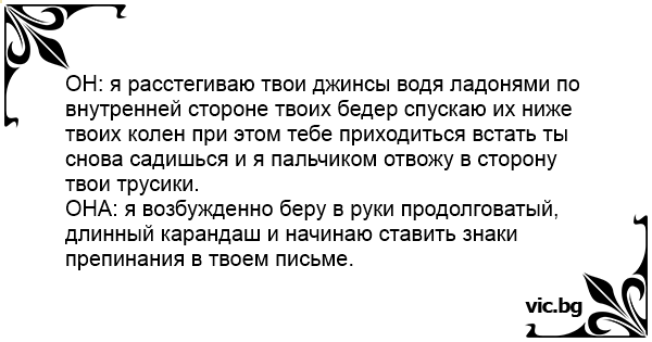 ОНА: я возбужденно беру в руки продолговатый, длинный карандаш и начинаю ставить знаки препинания в твоем письме.