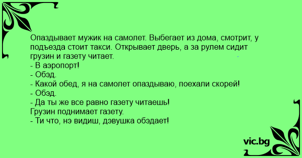 Опаздывает мужик на самолет. Выбегает из дома, смотрит, у подъезда стоит такси. Открывает дверь, а за рулем сидит грузин и газету читает.