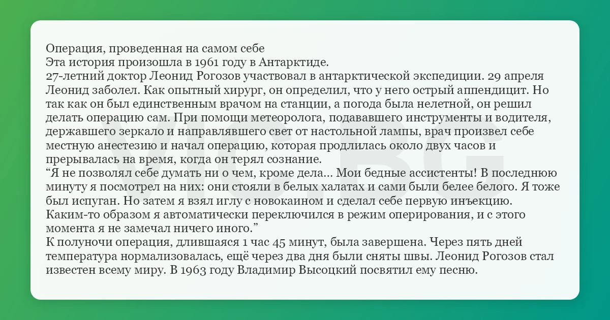 Операция, проведенная на самом себе Эта история произошла в 1961 году в Антарктиде. 27-летний доктор Леонид Рогозов участвовал в антарктической экспедиции. 29 апреля Леонид заболел. Как опытный хирург, он определил, что у него острый аппендицит. Но так как он был единственным врачом на станции, а погода была нелетной, он решил делать операцию сам. При помощи метеоролога, подававшего инструменты и водителя, державшего зеркало и направлявшего свет от настольной лампы, врач произвел себе местную анестезию и начал операцию, которая продлилась около двух часов и прерывалась на время, когда он терял сознание. “Я не позволял себе думать ни о чем, кроме дела… Мои бедные ассистенты! В последнюю минуту я посмотрел на них: они стояли в белых халатах и сами были белее белого. Я тоже был испуган. Но затем я взял иглу с новокаином и сделал себе первую инъекцию. Каким-то образом я автоматически переключился в режим оперирования, и с этого момента я не замечал ничего иного.” К полуночи операция, длившаяся 1 час 45 минут, была завершена. Через пять дней температура нормализовалась, ещё через два дня были сняты швы. Леонид Рогозов стал известен всему миру. В 1963 году Владимир Высоцкий посвятил ему песню.