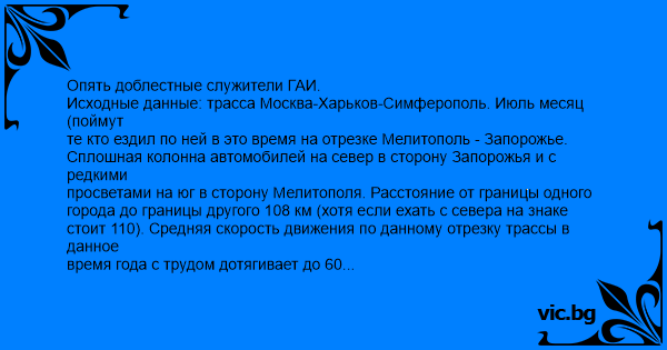 Опять доблестные служители ГАИ. Исходные данные: трасса Москва-Харьков-Симферополь. Июль месяц (поймут те кто ездил по ней в это время на отрезке Мелитополь - Запорожье. Сплошная колонна автомобилей на север в сторону Запорожья и с редкими просветами на юг в сторону Мелитополя. Расстояние от границы одного города до границы другого 108 км (хотя если ехать с севера на знаке стоит 110). Средняя скорость движения по данному отрезку трассы в данное время года с трудом дотягивает до 60 км/ч, и то, если не встрянешь за каким-нибудь комбайном, перегоняемым своим ходом. Далее со слов своего кума от первого лица. Мне назначено быть в каком-то там фонде (или контролирующем органе) на 15 часов. В 14:10 я, замотавшись по делам, наконец, выезжаю из Мелитополя на своей рабочей лошадке (чудо отечественного машиностроения - "Таврия", правда с двигателем из экспериментального цеха, точный объем которого никто не знает, но внешне это тот же движок). Вижу дикое скопление машин, понимаю, что если не успею - будет очень неприятно. Давлю "на тапочку" и разгоняю машину. Опыт вождения есть еще с детсва на картинге (потом багги), так что без труда подбираю ритм выезда на встречку для обгона колонны. Незаметно увлекся, скорость растет. При очередном обгоне где-то 4-х груженых фур за раз, в зеркале заднего вида замечаю пару иномарок, выскочивших из просветов между грузовиками, и пытающихся меня догнать. Но видать или динамики разгона не хватило или просто не рассчитали свои силы, или обида от того что их кинула какая-то "Таврия" была не такая сильная, но догнать они меня не смогли. Первой за мной шла "Альфа" красивого ярко красного цвета, но при очередном обгоне ей пришлось тормозить до появления дыма от покрышек и спешного поиска ниши в колонне - ну не успевала она. Хотя про слабую обиду я наверное погорячился. Через километров 20 такой погони мы шли плотной колонной, то есть я и за мной где-то десяток дорогих машин, который тоже куда-то торопились, но каждый по своим делам. Гаишники начали попадаться внезапно, вдали от известных всем и излюбленных ими мест. Но сержантик (а может старшина) только и смог развести руки, в одной из которых полосатая палочка, а в другой свисток. Правда мобильник в экипировке, наверное, появился, так как на довольно приличном расстоянии (километров через 30 от первой встречи) была расставлена засада в лучших традициях охоты на быстробегающих. Еду я на очередной обгон и вижу, как за довольно широким изгибом дороги стоит вереница милицейских машин, один из гайцов тормозит фуру, а остальные выстраиваются вдоль дороги на некотором расстоянии и тормозят по очереди каждого из нашей змейки спешащих. Тормознули всю колонну. Меня лично остановил целый майор. Я, правда, пролетел метров триста лишних, но как порядочный задним ходом по обочине сдал к нему, чтоб по жаре не пришлось далеко ходить. Майор, кстати, оказался мужиком нормальным. Им передали информацию, что со скоростью 158 (!) км/ч пронеслась мимо поста "Таврюха" с восьмерочным движком, а за ней гонится колонна. Скорость похожая отбилась и на втором радаре, а может на первом меньше была, но показали мне именно 158. Я сказал, что такого не может быть, так как по паспорту эта машина больше 140 не разгоняется, потом открыл капот, продемонстрировал движок. Несколько человек по очереди подошли и заглянули под капот, сказали, ч