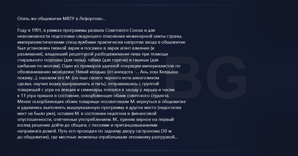Опять же общежитие МВТУ в Лефортово... . Году в 1991, в рамках программы развала Советского Союза и для невозможности подготовки следующего поколения инженерной элиты страны, империалистическими спецслужбами практически напротив входа в общежитие был установлен пивной ларек и посажен в ларек агент влияния (и разливания), владевший рецептурой разбодяживания пива при помощи стирального порошка (для пены), табака (для горечи) и гашиша (для шибания по мозгам). Один из примеров удачной операции империалистов по оболваниванию молодежи: Некий келдыш (от анекдота -... Ань, хош Келдыша покажу...), назовем его М. (он еще своего черного кота алкоголиком сделал, научил водку выпрашивать и пить), отправившись с группой товарищей с утра на лекции и семинары, попался в засаду у ларька и часам к 11 утра пришел в состояние, оскорбляющее облик советского студента. Менее оскорбляющие облик товарищи посоветовали М. вернуться в общежитие и удалились выполнять выщеуказанную программу в другое место (недостатка мест не было уже), оставив М. в состоянии недогона и финансовой опустошенности, отягченных употреблением. М., приняв верное на первый взгляд решение дойти до общаги, с песнями и пританцовываниями направился домой. Путь его проходил по заднему двору гастронома (30 м до общежития), где местные люмпены отрабатывали опохмелку разгрузкой машины с сахаром. Решение проблемы недостатка финансирования и нехватки алкоголя в крови молнией мелькнуло в разгоряченном мозгу, и вот уже наш герой бежит с коробкой рафинада на плече ко входу в родное общежитие (25 м), петляя и падая, подгоняемый истошными воплями продавщиц и грузчиков. Продавщицы и грузчики, конечно, за ним войти в общежите не решились (оцените мрачную репутацию, а?) Ну сколько времени нужно, чтоб сбегать в соседний дом за участковым, обьяснить тому ситуацию три раза, еще немного выпить для храбрости с участковым, найти притон наглого грабителя (и не думающего скрываться), еще немного выпить всей командой и ворваться для вершения правосудия в означенный притон (то бишь комнату, где проживал М.)? От силы 40-50 минут. Так вот - за это время М. успел продать/обменять сахар на водку и с друзьями (ставшими, таким образом соучастниками) водку выпить, раздеться и упасть спать лицом вниз на голую сетку панцирной (железной) кровати, что его впоследствии и спасло. Рассказчик присоединился к шабашу, услышав раскатистый, переходящий в истерику, смех участкового, поднявшего М. с сетки и увидевшего в квадратных отпечатках сетки на лице и теле лишенца знаки судьбы, повествующие о тюремных решетках. Именно вид комнаты, заваленной книгами и чертежами (серьезно) и ужасающий вид не стоящего на ногах, мычащего (очень худого, кстати) М., всего в квадратах отпечатков сетки, пробудил добрые, отеческие чувства участкового, может быть, воспоминания о собственной, наверняка беспутной, молодости и вердикт был вовсе не суров - немедленно вернуть сахар или его денежный эквивалент в магазин и бутылку коньяка с отсрочкой - участковому. Что и было немедленно исполнено друзьями и соседями. Рассказчик руководил через некототое время разбором полетов и процессом похмеления, переросшим в пьянку без особых последствий, так что достоверность рассказа высочайшая. М. диплом таки защитил, нынче хозяин солидной фирмы. Привет, М.!