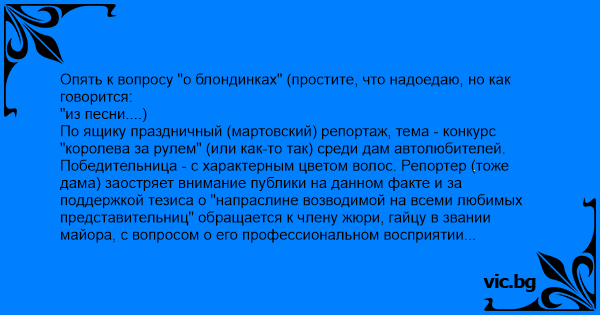 По ящику праздничный (мартовский) репортаж, тема - конкурс "королева за рулем" (или как-то так) среди дам автолюбителей. Победительница - с характерным цветом волос. Репортер (тоже дама) заостряет внимание публики на данном факте и за поддержкой тезиса о "напраслине возводимой на всеми любимых представительниц" обращается к члену жюри, гайцу в звании майора, с вопросом о его профессиональном восприятии дам-водителей-конкурсанток. Под давлением "обстоятельств" (торжественность момента, камера, внимание публики...) гаец бодрым тоном объявил, что "...дамы за рулем это богини!" а в вполголоса, как бы про себя, добавил: "...пассажиры молятся, а пешеходы крестятся." Он профессионал, знает о чем говорит.