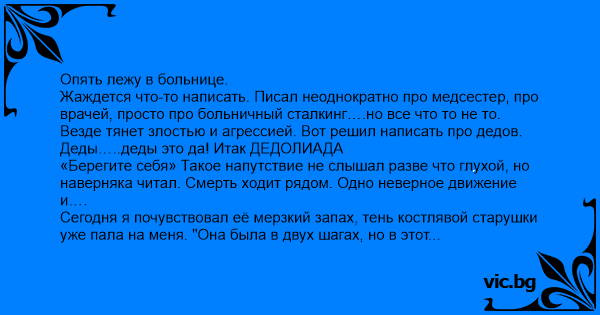 Жаждется что-то написать. Писал неоднократно про медсестер, про врачей, просто про больничный сталкинг….но все что то не то. Везде тянет злостью и агрессией. Вот решил написать про дедов. Деды…..деды это да! Итак ДЕДОЛИАДА