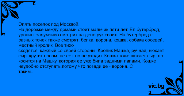 На дорожке между домами стоит мальчик пяти лет. Ел бутерброд, уронил, задумчиво смотрит на дело рук своих. На бутерброд с разных точек также смотрят: белка, ворона, кошка, собака соседей, местный кролик. Все тихо