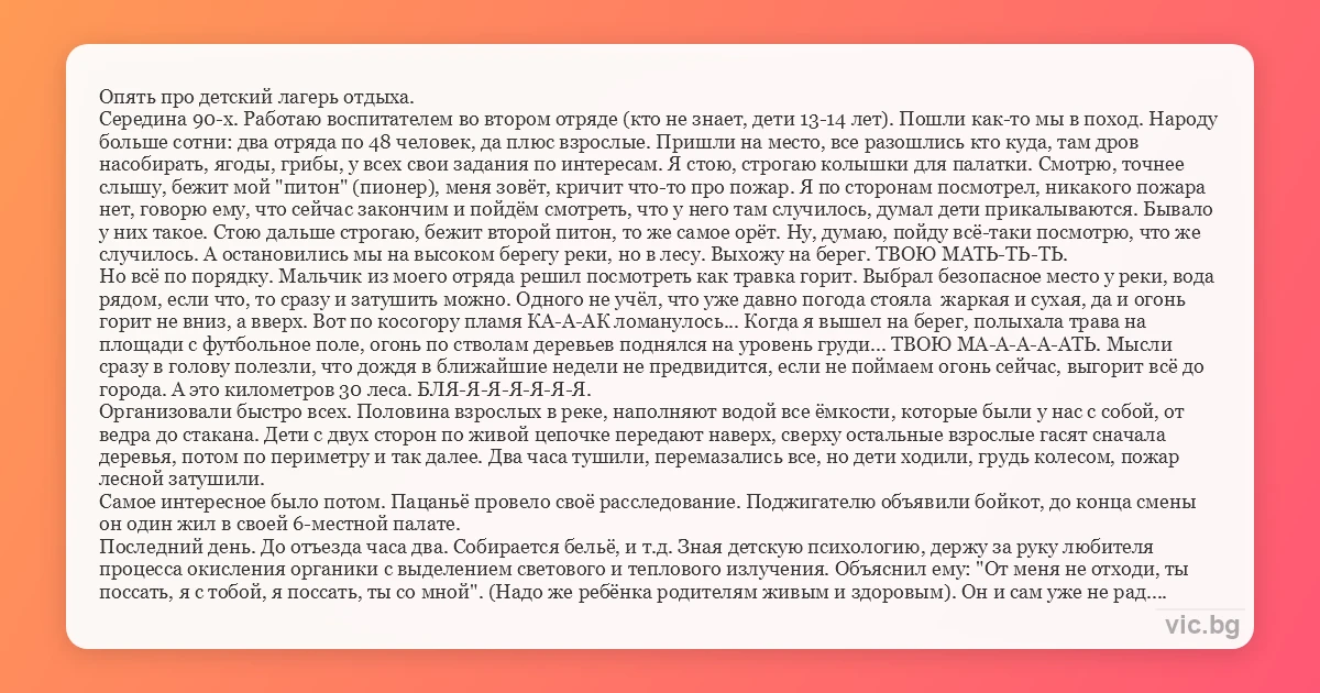 Середина 90-х. Работаю воспитателем во втором отряде (кто не знает, дети 13-14 лет). Пошли как-то мы в поход. Народу больше сотни: два отряда по 48 человек, да плюс взрослые. Пришли на место, все разошлись кто куда, там дров насобирать, ягоды, грибы, у всех свои задания по интересам. Я стою, строгаю колышки для палатки. Смотрю, точнее слышу, бежит мой "питон" (пионер), меня зовёт, кричит что-то про пожар. Я по сторонам посмотрел, никакого пожара нет, говорю ему, что сейчас закончим и пойдём смотреть, что у него там случилось, думал дети прикалываются. Бывало у них такое. Стою дальше строгаю, бежит второй питон, то же самое орёт. Ну, думаю, пойду всё-таки посмотрю, что же случилось. А остановились мы на высоком берегу реки, но в лесу. Выхожу на берег. ТВОЮ МАТЬ-ТЬ-ТЬ.