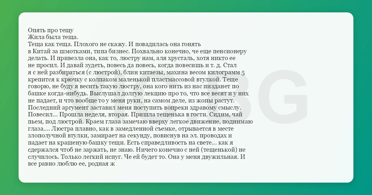 Опять про тещу Жила была теща. Теща как теща. Плохого не скажу. И повадилась она гонять в Китай за шмотками, типа бизнес. Похвально конечно, че еще пенсионеру делать. И привезла она, как то, люстру нам, аля хрусталь, хотя никто ее не просил. И давай зудеть, повесь да повесь, когда повесишь и т. д. Стал я с ней разбираться (с люстрой), блин китаезы, махина весом килограмм 5 крепится к крючку с колпаком маленькой пластмассовой втулкой. Теще говорю, не буду я весить такую люстру, она кого нить из нас пизданет по башке когда-нибудь. Выслушал долгую лекцию про то, что все весят и у них не падает, и что вообще то у меня руки, на самом деле, из жопы растут. Последний аргумент заставил меня поступить вопреки здравому смыслу. Повесил... Прошла неделя, вторая. Пришла тещенька в гости. Сидим, чай пьем, под люстрой. Краем глаза замечаю вверху легкое движение, поднимаю глаза.... Люстра плавно, как в замедленной съемке, отрывается в месте злополучной втулки, замирает на секунду, повиснув на эл. проводах и падает на крашеную башку тещи. Есть справедливость на свете... как я сдержался чтоб не заржать, не знаю. Ничего конечно с ней (тещенькой) не случилось. Только легкий испуг. Че ей будет то. Она у меня двужильная. И все равно люблю ее, родная ж