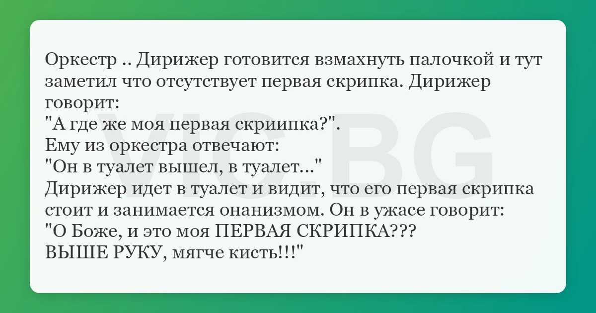 Оркестр .. Дирижер готовится взмахнуть палочкой и тут заметил что отсутствует первая скрипка. Дирижер говорит: "А где же моя первая скриипка?". Ему из оркестра отвечают: "Он в туалет вышел, в туалет..." Дирижер идет в туалет и видит, что его первая скрипка стоит и занимается онанизмом. Он в ужасе говорит: "О Боже, и это моя ПЕРВАЯ СКРИПКА??? ВЫШЕ РУКУ, мягче кисть!!!"