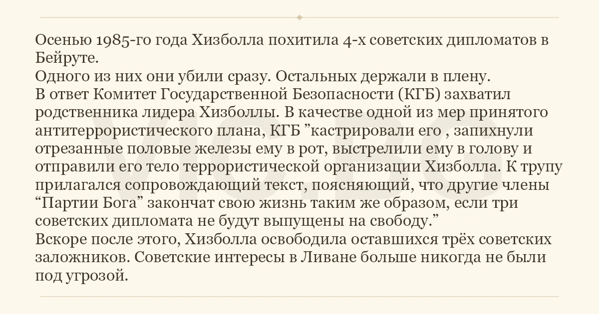 Осенью 1985-го года Хизболла похитила 4-х советских дипломатов в Бейруте. Одного из них они убили сразу. Остальных держали в плену. В ответ Комитет Государственной Безопасности (КГБ) захватил родственника лидера Хизболлы. В качестве одной из мер принятого антитеррористического плана, КГБ ”кастрировали его , запихнули отрезанные половые железы ему в рот, выстрелили ему в голову и отправили его тело террористической организации Хизболла. К трупу прилагался сопровождающий текст, поясняющий, что другие члены “Партии Бога” закончат свою жизнь таким же образом, если три советских дипломата не будут выпущены на свободу.” Вскоре после этого, Хизболла освободила оставшихся трёх советских заложников. Советские интересы в Ливане больше никогда не были под угрозой.