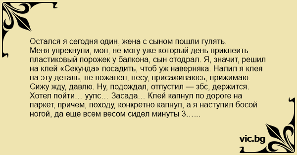 Меня упрекнули, мол, не могу уже который день приклеить пластиковый порожек у балкона, сын отодрал. Я, значит, решил на клей «Секунда» посадить, чтоб уж наверняка. Налил я клея на эту деталь, не пожалел, несу, присаживаюсь, прижимаю. Сижу жду, давлю. Ну, подождал, отпустил — збс, держится. Хотел пойти… уупс… Засада… Клей капнул по дороге на паркет, причем, походу, конкретно капнул, а я наступил босой ногой, да еще всем весом сидел минуты 3… Намертво, короче. Балкон открыт, проветривал, холодно, закрыть не могу. Мобила лежит на столе, вижу… Дотянуться - никак, домашний еще ближе, но тоже никак… Пытаюсь отклеиться — больно, не получается, намертво сижу. Жена будет гулять еще минимум час. Сначала я назвал себя всем тем, чем называю тех, кто меня подрезает на дороге… Попробовал поплевать, может размочу немного, нифига. Потом подумал… А может мне, я извиняюсь, поссать на ногу? Может прокатит?! Я не должен был дать себя обнаружить в таком идиотском положении, она бы смеялась ещё год… Ну, решился, поссал… Ничего подобнго!! В итоге: я замерзший, приклеенный и обоссаный… Сижу курю, жду неминуемого стыда и стеба жены. Звонит, я не открываю, разумеется… Вертит ключами, ну, думаю всё, ща начнется… Если коротко, то после осознания, что произошло она тупо упала на пол и билась в истерике… Потом подошла ближе, поняла что я сижу в луже, узнав, что это за лужа упала еще на 5 минут. Взяв с меня обещание сводить ее в ресторан, принесла мне бутыль растворителя… У меня теперь психологическая травма, вот так вот.