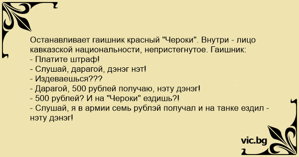 Останавливает гаишник красный "Чероки". Внутри - лицо кавказской национальности, непристегнутое. Гаишник: - Платите штраф! - Слушай, дарагой, дэнэг нэт! - Издеваешься??? - Дарагой, 500 рублей получаю, нэту дэнэг! - 500 рублей? И на "Чероки" ездишь?! - Слушай, я в армии семь рублэй получал и на танке ездил - нэту дэнэг!